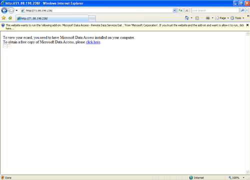 ---------------------------------------------Some of the subject lines used by these cards are: Animated card Love postcard Thank you postcard Birthday e-card Animated e-card Funny card Holiday ecard Musical e-card After clicking on the URL in the body of the message, a screen appears asking you to download "Microsoft Data Access" to view the message. ![]() You'll notice the popup asking you to install the program even mentions it's from "Microsoft Corporation". ![]() Then the msdataccess.exe file infects the computer and causes a chain reaction of disabling security programs like antivirus and firewalls, joining a peer-to-peer botnet to receive more commands and dangerous software from a wide range IP addresses, corrupting a file called TCPIP.SYS, and changing your DNS settings on your local area network or dialup connection. Once your computer is infected, its difficult to remove. Scanning MSDATAACCESS.EXE with a Virus Scanner Before I installed this dangerous file, I used Jotti's Malware Scanner to check the file. Jotti's scan checks the file with a variety of scanning engines to see if its dangerous. Many times, one scanner wont report a problem while another one will. Here are the results after scanning msdataaccess.exe: Jotti Scan Results Scan taken on 16 Aug 2007 17:54:11 (GMT)