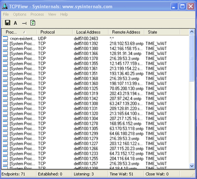 After installing the file, my computer immediately starting opening connections and sending spam to a variety of addresses. I used a program called TCPView to show this flood of email.